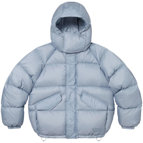 Голубой мужской пуховик с логотипом на капюшоне FW24