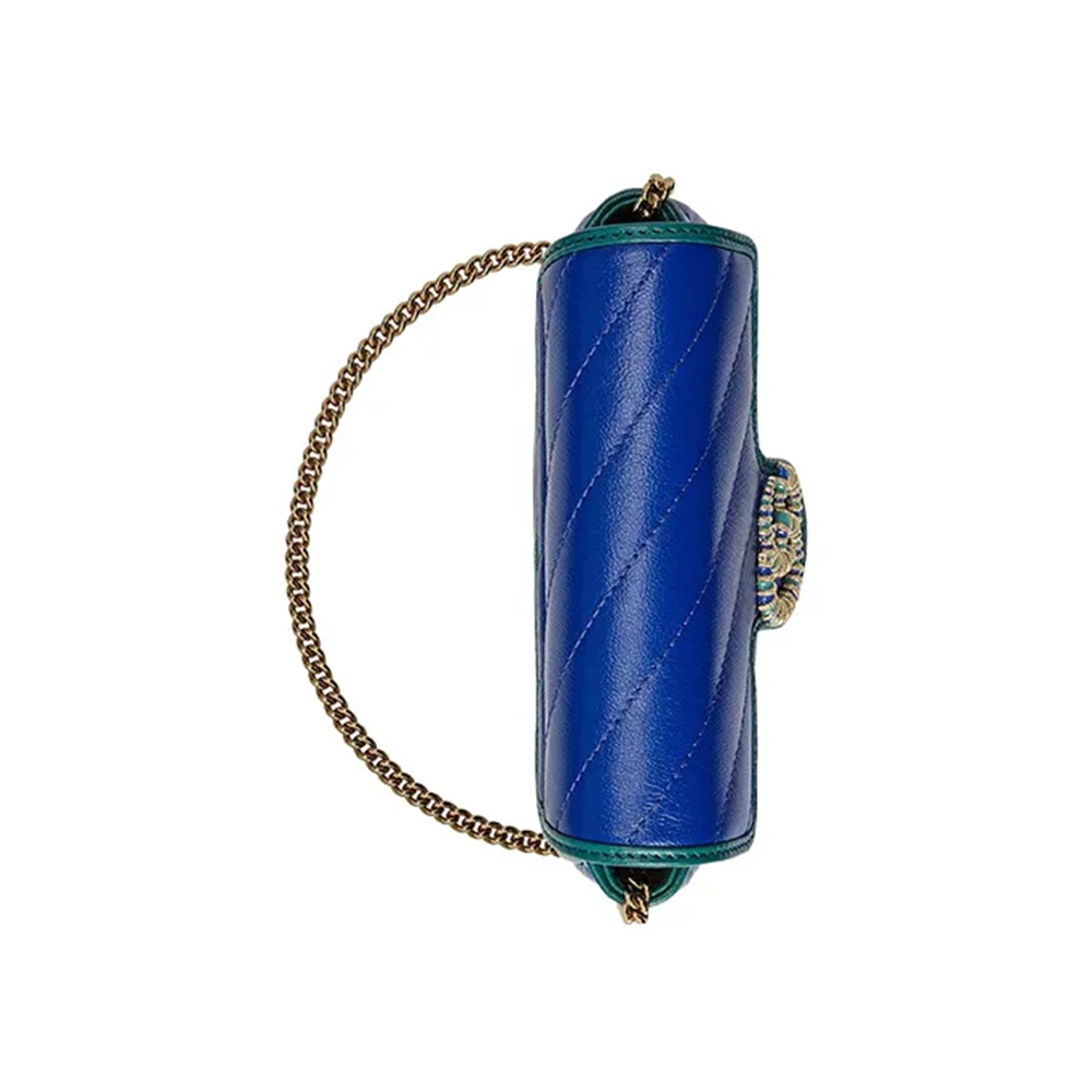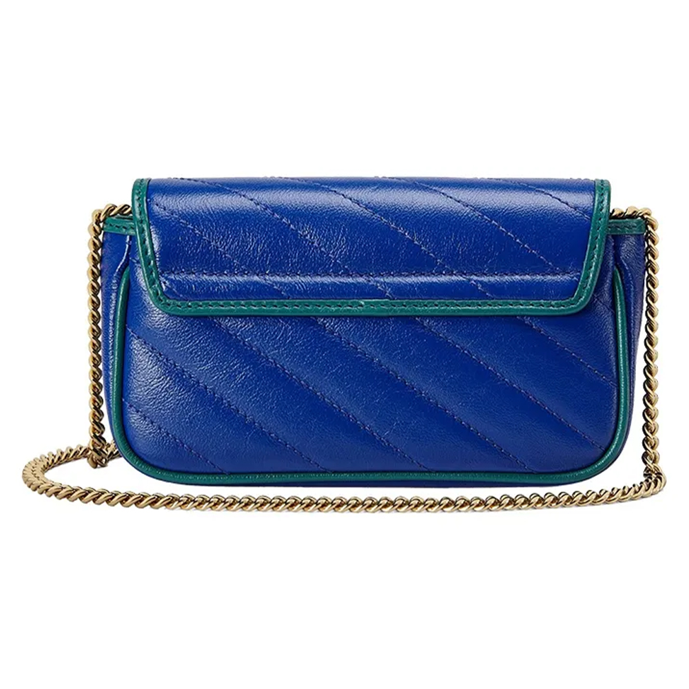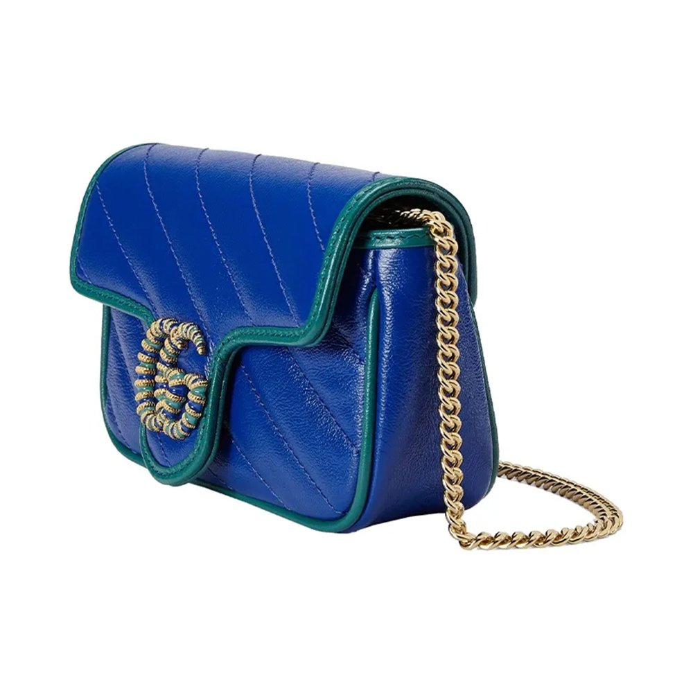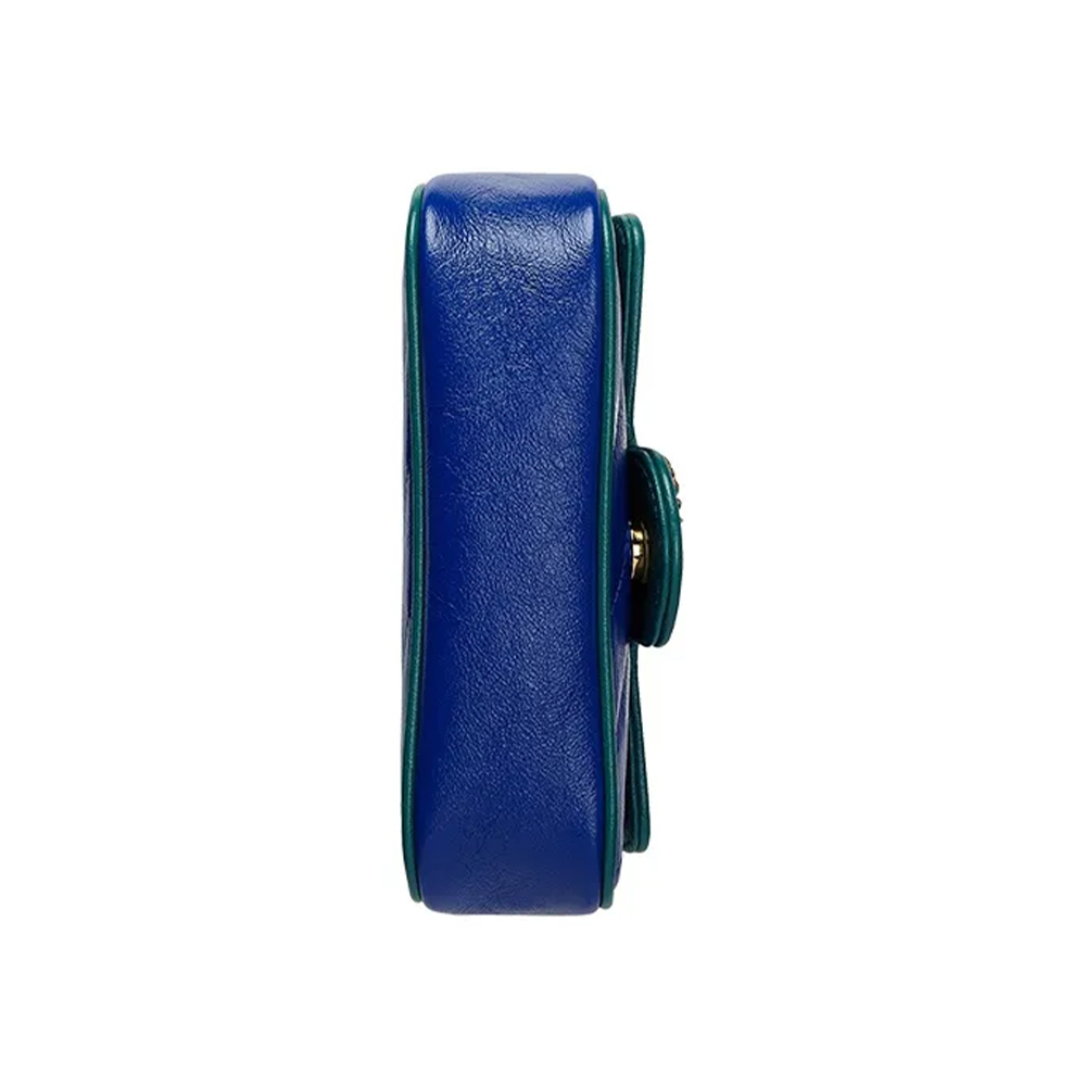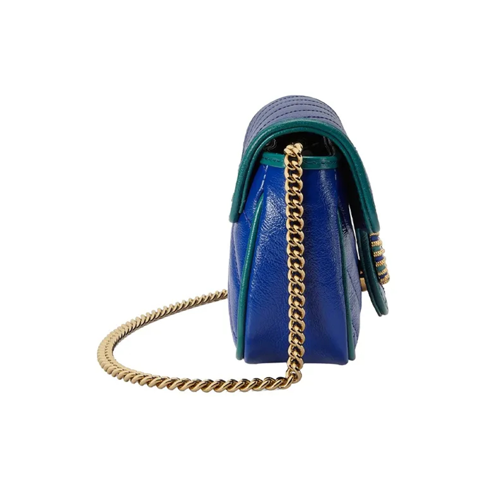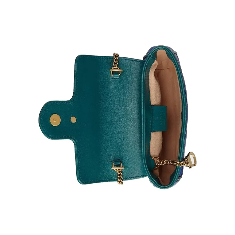 Эффектная мини-сумка GG Marmont из коллекции Ouverture выполнена из мягкой кожи мателассé с диагональной строчкой и сочетает насыщенные оттенки синего и зеленого. Яркий дизайн вдохновлён сиянием драгоценных камней, а узнаваемая фурнитура Double G, покрытая эмалью, придаёт модели характер и элегантность.