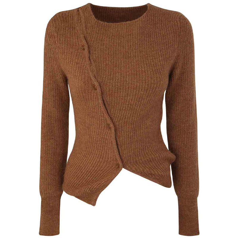 Бежево-коричневый, трикотаж в рубчик, круглый вырез, асимметричная застежка на пуговицах спереди, длинные рукава и прямой подол.