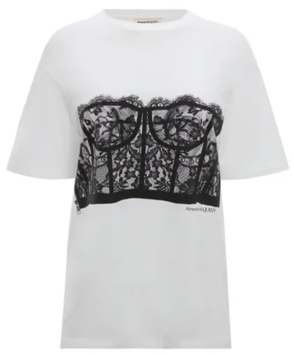 Создайте смелый и запоминающийся образ с помощью женской белой футболки Alexander McQueen SS22. Заниженные плечи и оригинальный принт "Кружевной бюстгальтер" придают этой футболке с коротким рукавом уникальный и дерзкий характер.