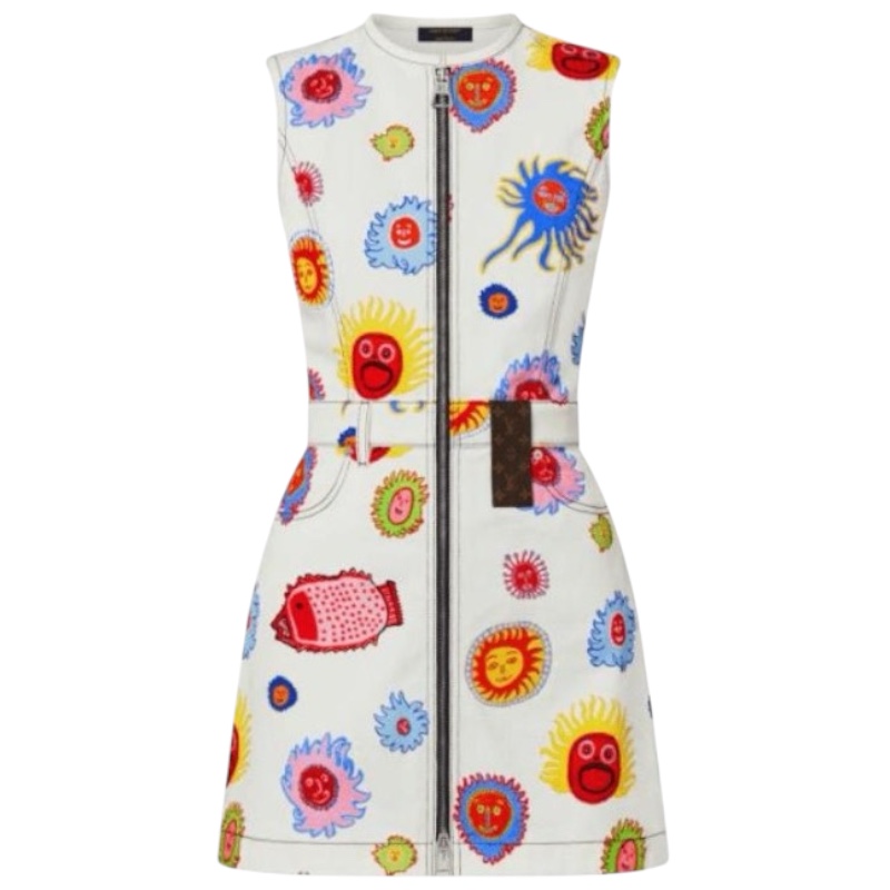 Этот шикарный спортивный стиль подчеркнут сюрреалистическими подписями «Faces» из капсулы Louis Vuitton x Yayoi Kusama, вдохновленными радостными образами из серии картин под названием «Моя вечная душа», которую художник начал в 2009 году. Платье на молнии подчеркивает женственный силуэт и дополнено встроенным поясом, подчеркивающим талию. В сочетании с кроссовками LV x YK Time Out создаст свежий образ.