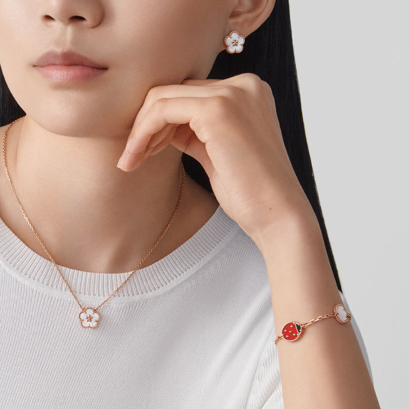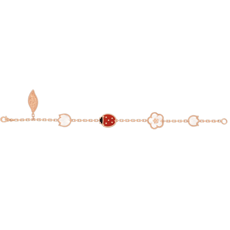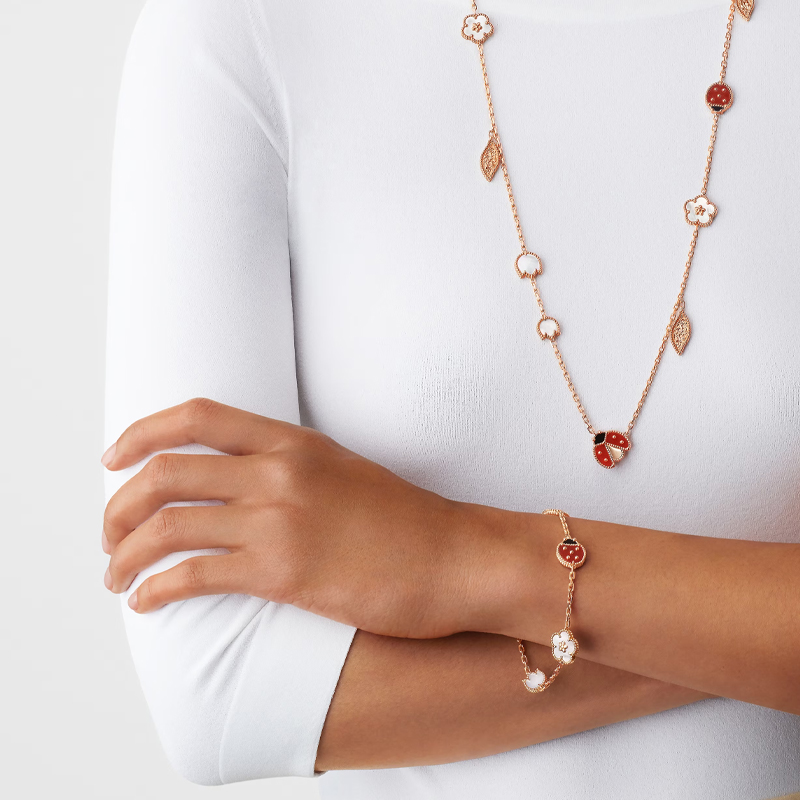 Коллекция Lucky Spring®, украшенная божьими коровками и цветочными мотивами, является данью весне – сезону обновления, столь дорогому сердцу Van Cleef & Arpels. Изготовленные из розового золота 18 карат, сердолика и оникса, эти творения дополняют доброжелательную атмосферу мира Дома.