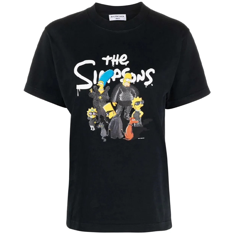 Футболка Small Fit из черного винтажного джерси с рисунком, отсылающим к семье The Simpsons TM & © 20th Television, одетой в узнаваемые вещи Balenciaga из прошлых сезонов.
