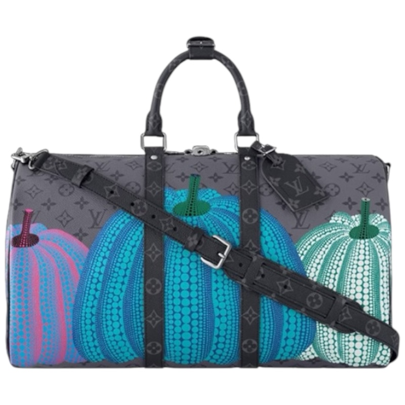 Дорожная сумка Louis Vuitton Keepall 45 с принтом тыквы из коллекции Yayoi Kusama — это эксклюзивная модель, выполненная в узнаваемом стиле монограмма. Она украшена яркими, красочными тыквами, созданными в технике пуантилизма, известной японской художницы Яёи Кусамы.