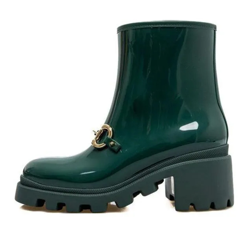 Эти женские ботильоны выполнены из глянцевого каучука насыщенного зеленого цвета. Завершает дизайн культовая фурнитура Horsebit, напоминающая о связи Дома с миром верховой езды.