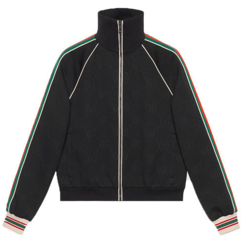 Спортивная олимпийка свободного кроя на молнии выполнена в винтажном стиле из джерси в характерных цветах Дома: черном, зеленом и красном. Модель украшает жаккардовый узор GG — спортивная интерпретация узнаваемого логотипа Gucci.