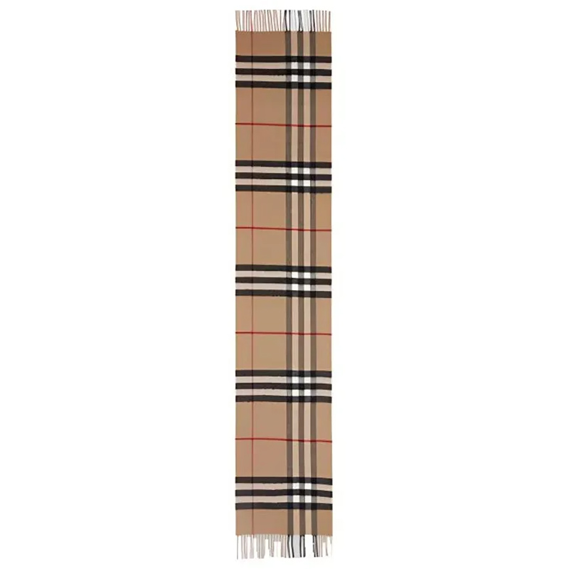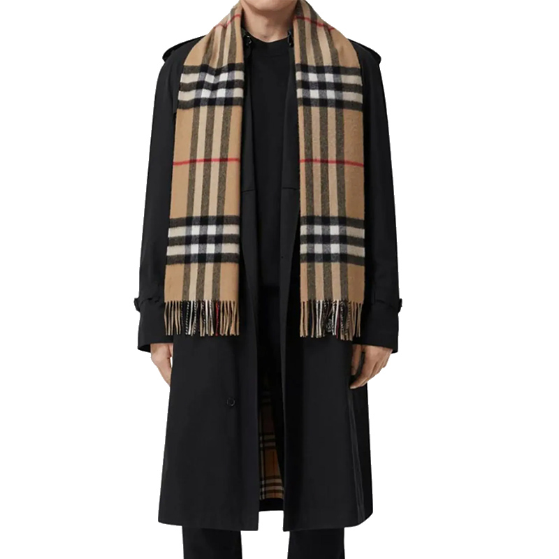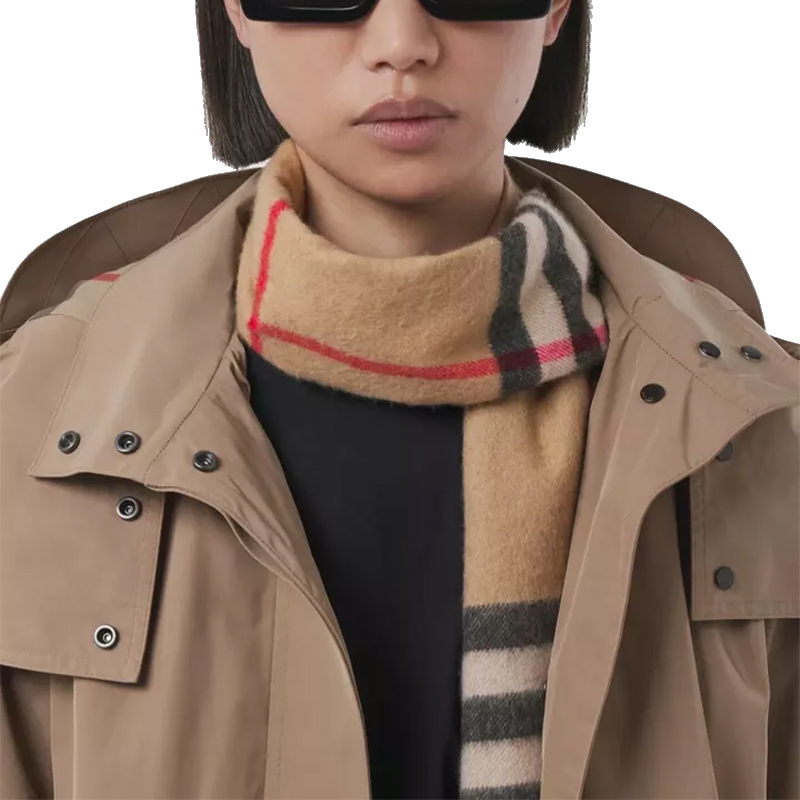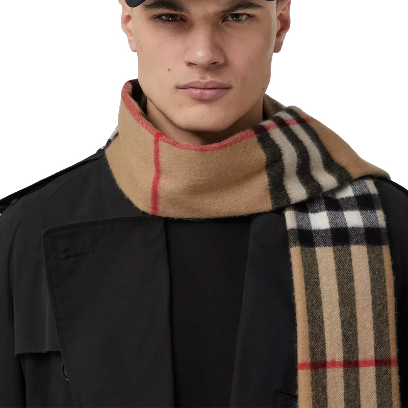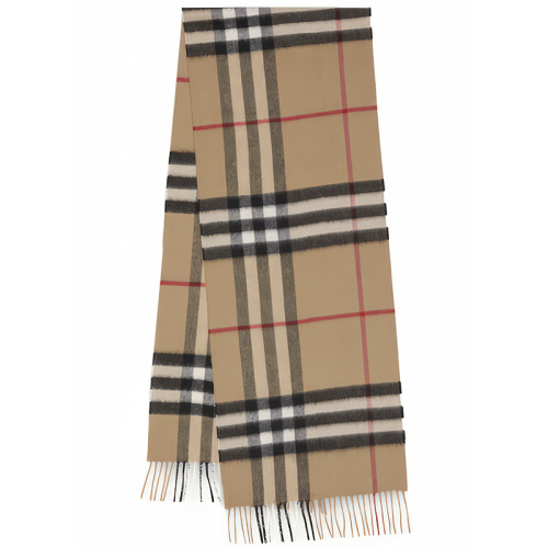 Частью новой коллекции Burberry стал широкий шарф песочного оттенка с культовым мотивом Vintage Check, выполненный в Шотландии на фабрике с 200-летней историей из натурального кашемира на основе вычесанного вручную пуха длиннорунных коз. Весь процесс состоял из 30 этапов, среди которых есть и ручные операции — вымачивание материала в ключевой воде и вычесывание уже готового изделия натуральными ворсовальными шишками для придания особой мягкости. Аксессуар украсили длинной бахромой.