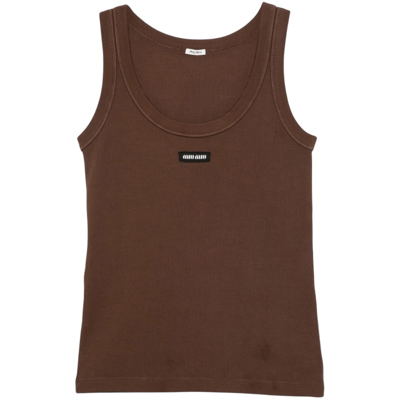 Вышитый логотип Miu Miu с его культовым штрихом выделяется на простых, облегающих линиях этого топа.