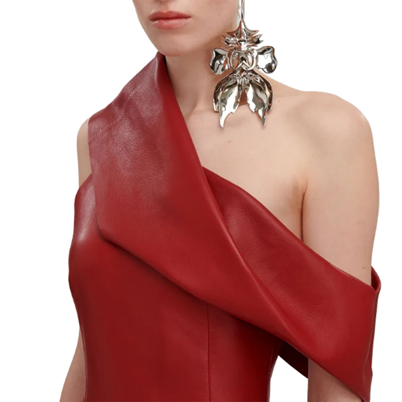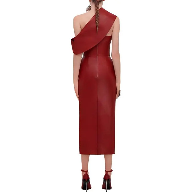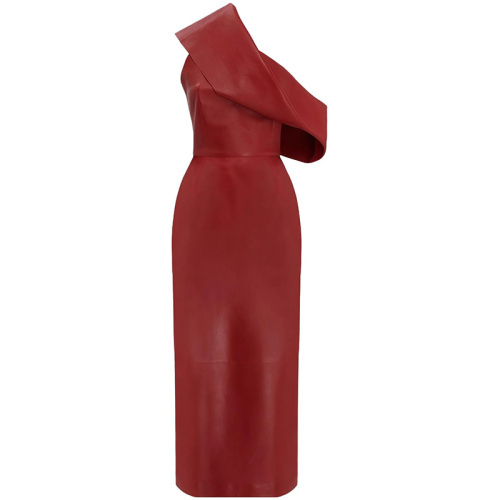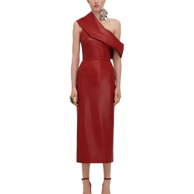Красное кожаное платье миди с драпировкой.