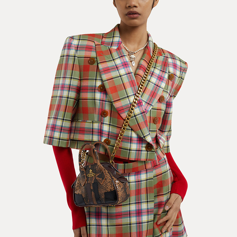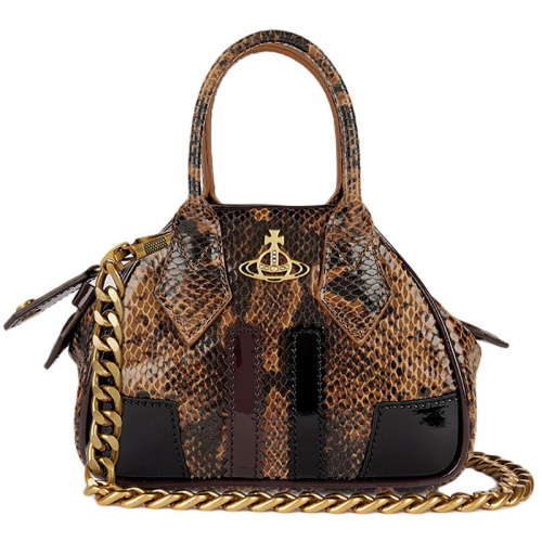 Мини-сумка Yasmine Chain - это новая интерпретация архивной сумки "Yasmine", впервые представленной на показе коллекции "Time Machine" Gold Label осень-зима 1987-88. Сумка названа в честь французского дизайнера Ясмин Эслами, которая работала с Вивьен в конце 80-х годов. Эта модель получила детали с принтом "змеиная кожа" и отделку с рельефным контуром, вдохновленную архивными кроссовками "Hammer Head" из коллекции "Pirate" Vivienne Westwood осень-зима 1981-82.