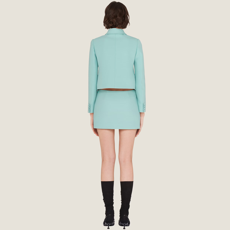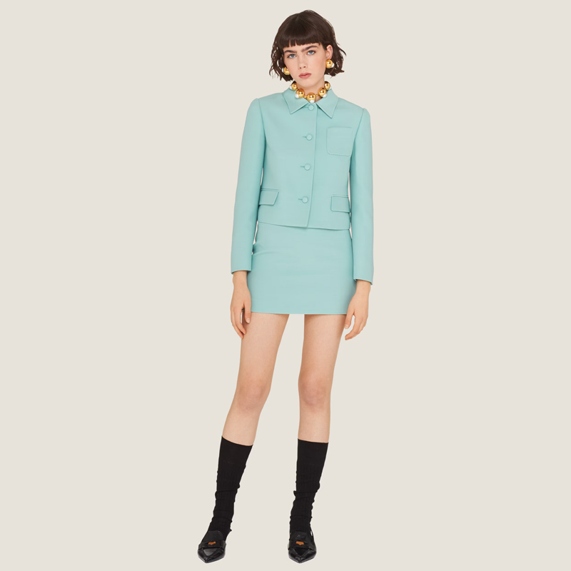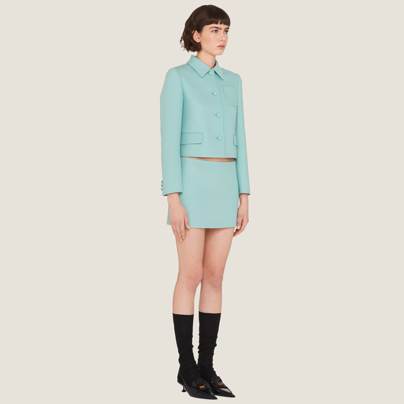 Этот жакет из саржевого трикотажа воплощает чистый, простой и современный дизайн. Miu Miu сочетает повседневную и формальную одежду, переплетает эстетический язык повседневности и индивидуальности, играет с традиционными материалами и дизайном и создает новые силуэты.
