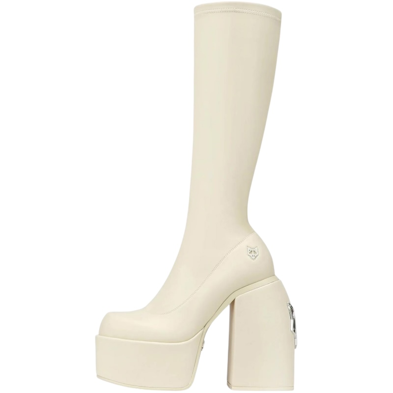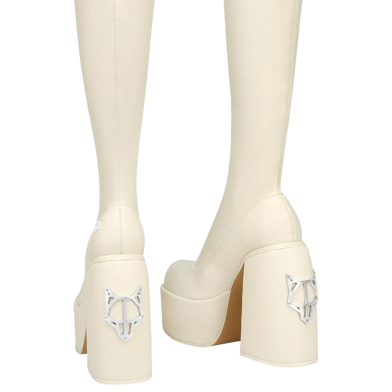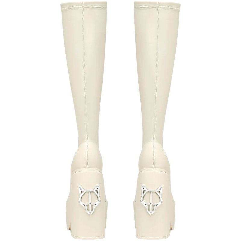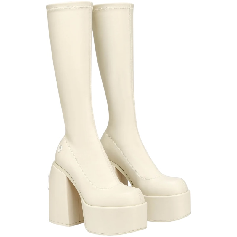 Под коленом облегающая платформа. Ботинки в стиле 90-х, изготовленные из веганского облегающего верха из эластичного материала на специально разработанной платформе и конструкции каблука Naked Wolfe. С нашей табличкой с головой волка Naked Wolfe на пятке и металлической табличкой с головой волка, встроенной в пятку.