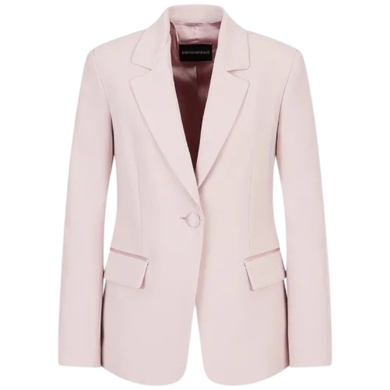 Естественный блеск атласа изящно освещает этот пиджак с классической однобортной застежкой, создавая изысканные точки света на профиле карманов и на соответствующей полосе, расположенной вертикально на рукавах. Внутренняя атласная подкладка. Воротник с лацканами, с подплечником, двумя карманами и застежкой спереди на 1 пуговицу. Разрез на спине.