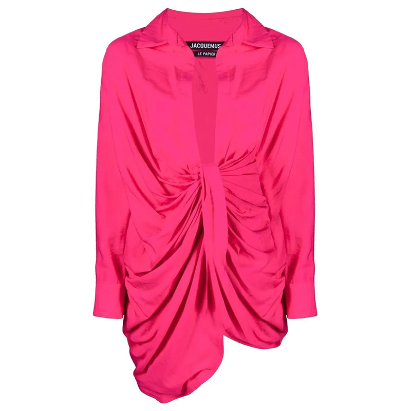 Фуксия, драпировка, глубокий V-образный вырез, длинные рукава, манжеты на пуговицах и длина выше колена.