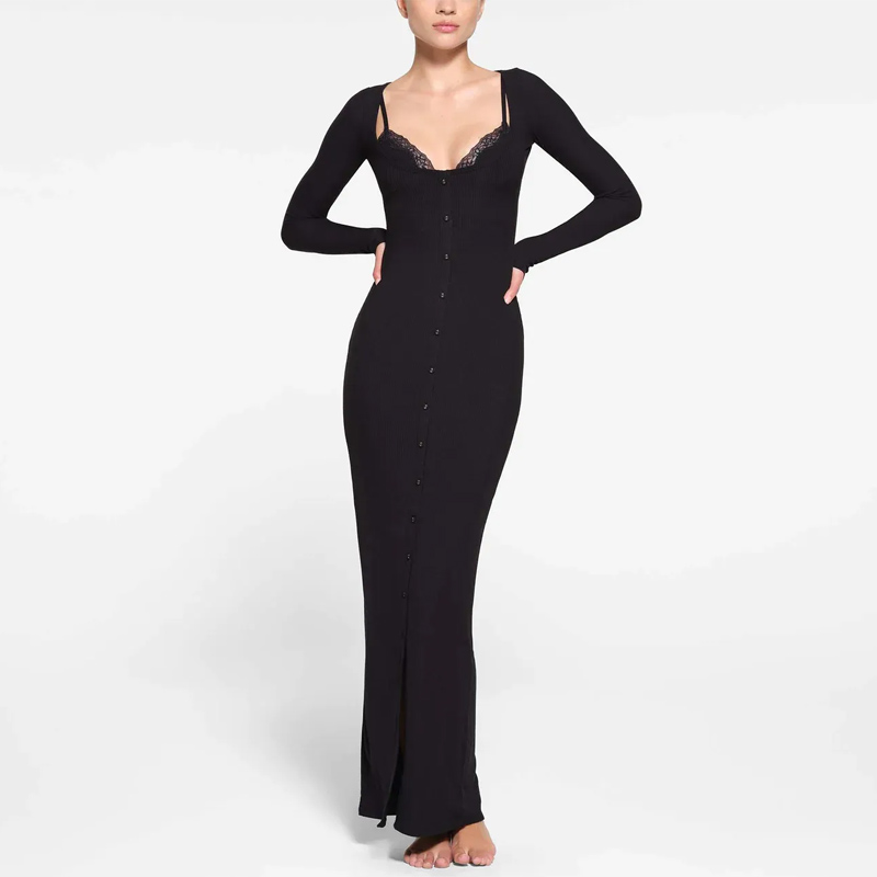 Платье с длинными рукавами со вставкой кружевного бралетта SKIMS SOFT LOUNGE DRESS ONYX