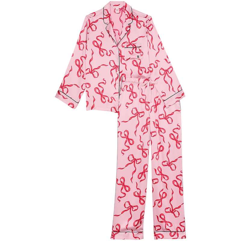 Розовая сатиновая пижама с принтом из бантиков
