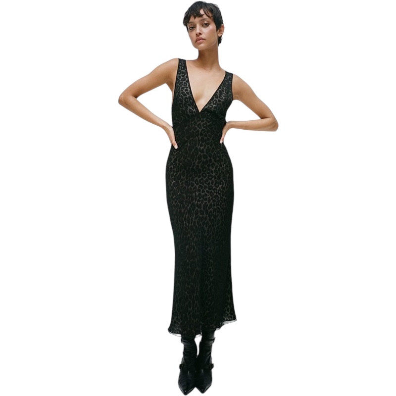 Платье с двойным слоем, с леопардовым принтом и с тонким черным прозрачным шифоном сверху.