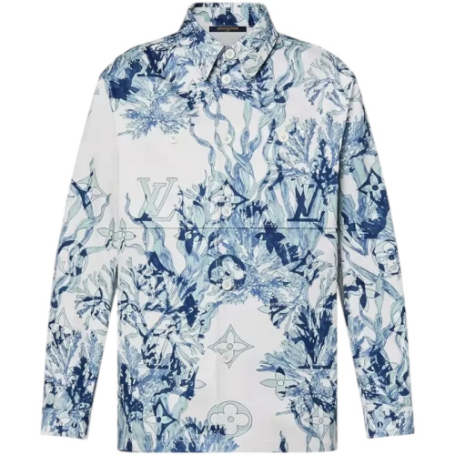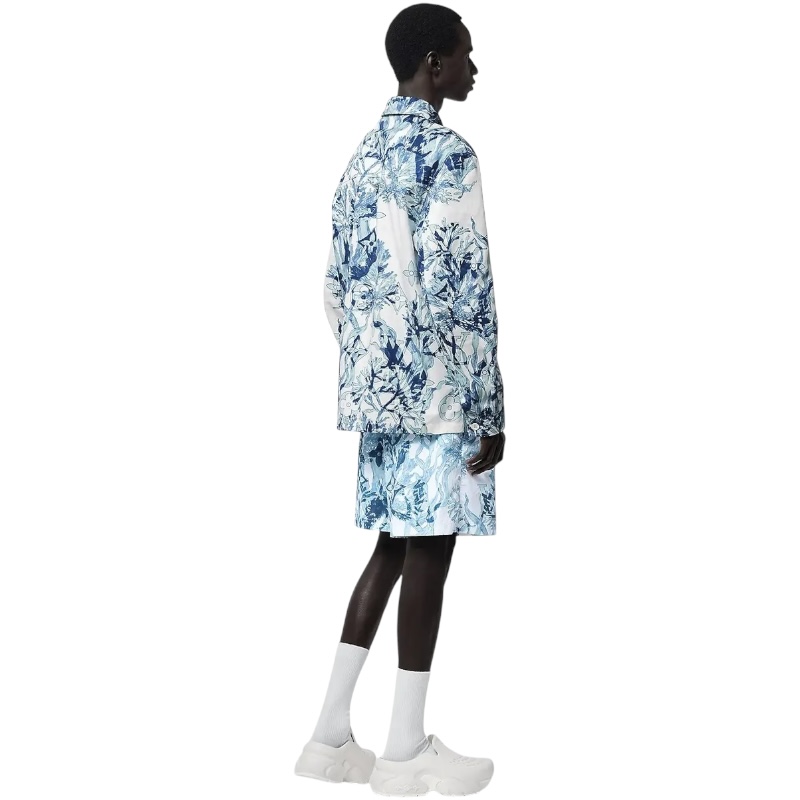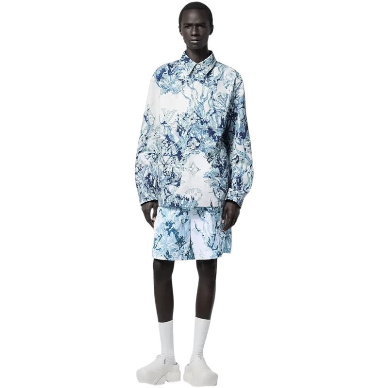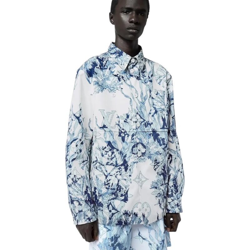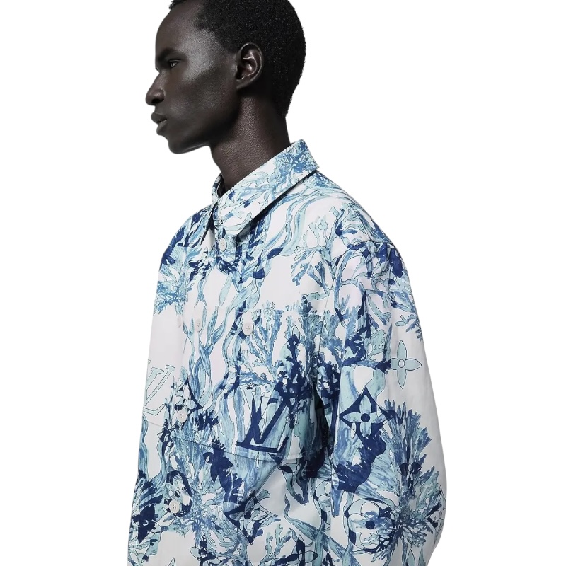 Рубашка украшена графическим принтом Monogram Aquagarden с изображением нежных листьев водорослей и кораллов в голубых тонах.