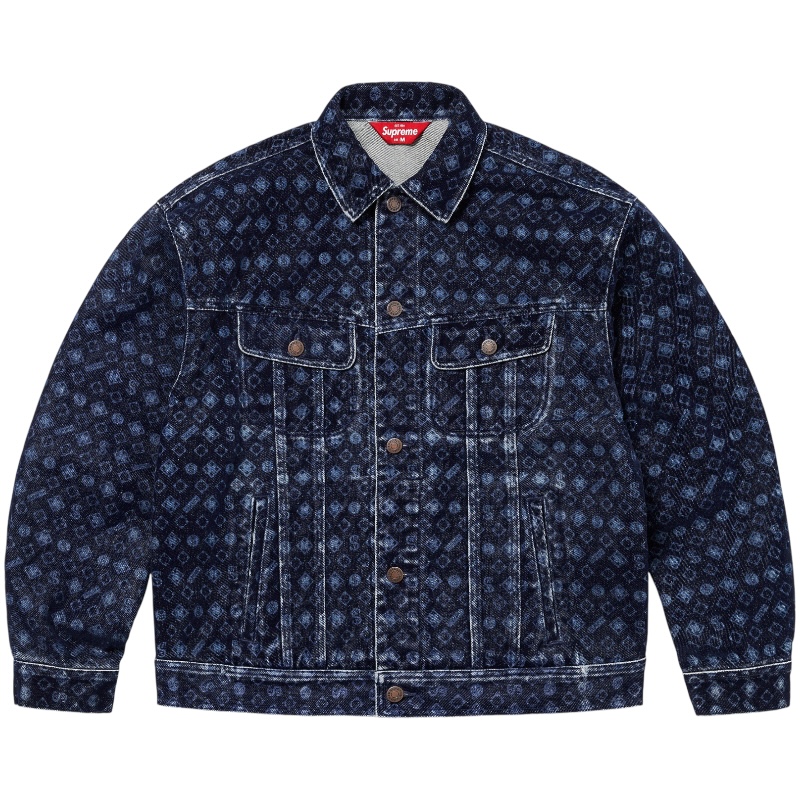 Добавьте яркости в свой образ с синей джинсовой курткой FW24, украшенной стильным узором из флока.