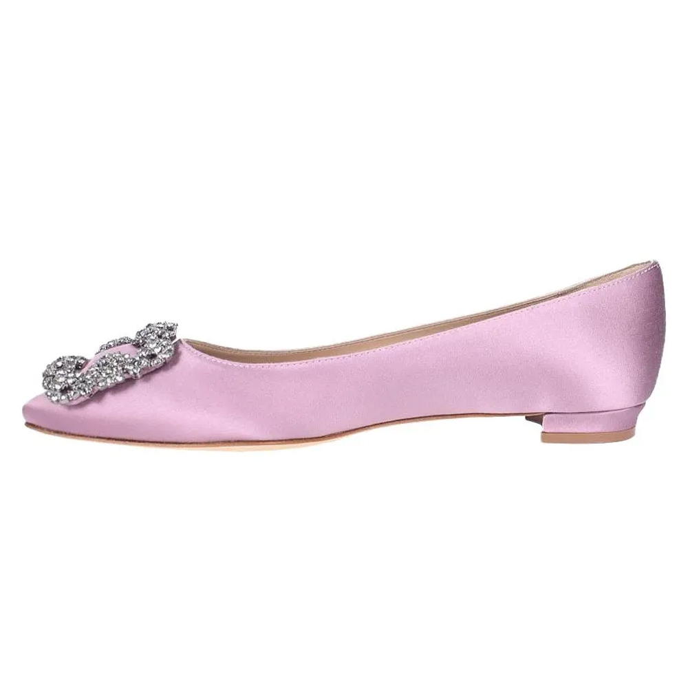 Балетки Hangisi — воплощение изысканности в современной интерпретации. Выполненные из сияющего шелкового сатина в нежном лавандовом оттенке, они украшены фирменной квадратной пряжкой, инкрустированной кристаллами, — узнаваемым акцентом, ставшим символом утончённого вкуса. Миндалевидный носок придаёт образу изящество, а невысокий каблук делает пару идеальной как для дневных, так и для вечерних выходов. Особенно выразительно модель смотрится в сочетании с одеждой нейтральных тонов — как драгоценность в завершении образа.
