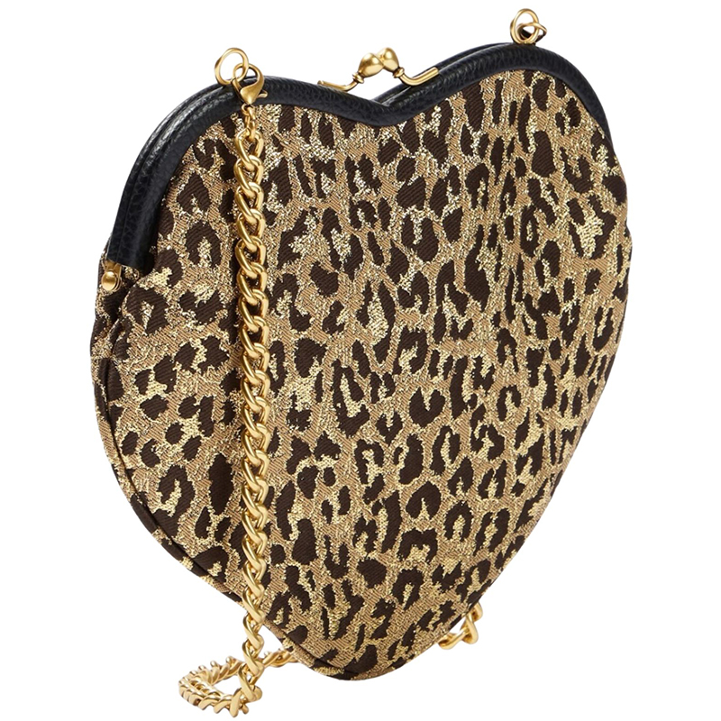Сумочка Belle Heart Frame с застежкой-защелкой, узором из леопардового жаккарда и золотистым логотипом бренда спереди.