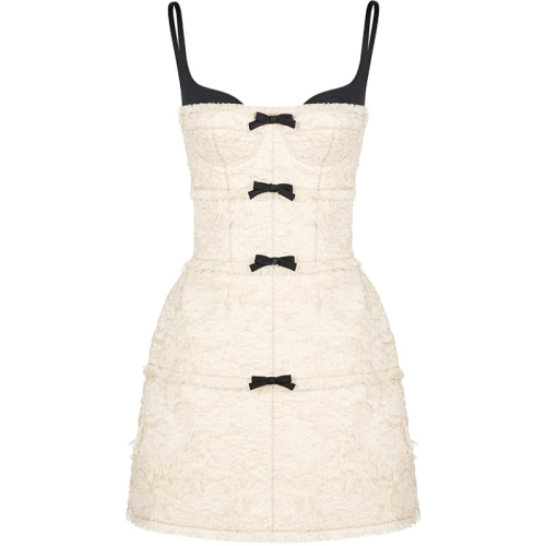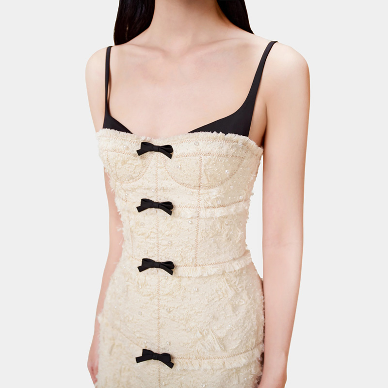 Твидовое платье мини на бретельках с бантиками слоновая кость